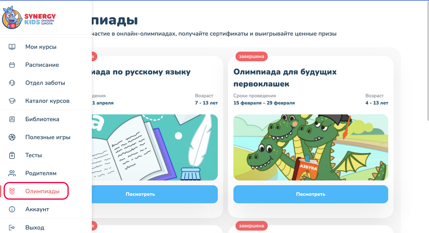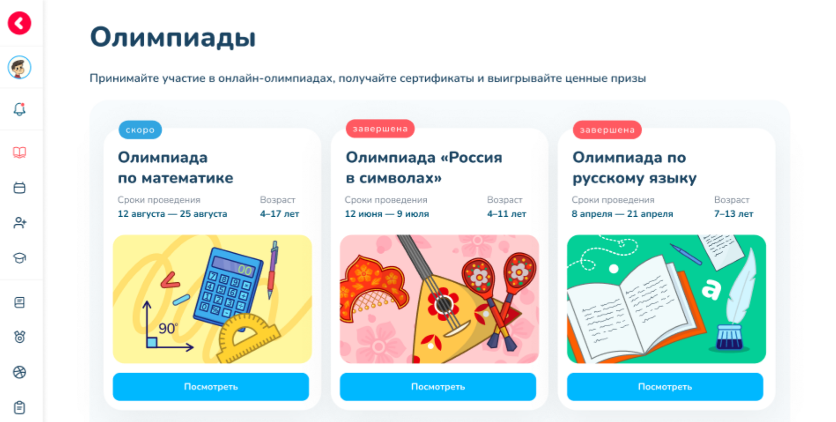 - Выберите нужную олимпиаду, кликнув кнопку «Посмотреть». Обратите внимание, что в разделе отображаются все олимпиады: актуальные, в которых можно принять участие прямо сейчас, а также прошедшие и будущие.