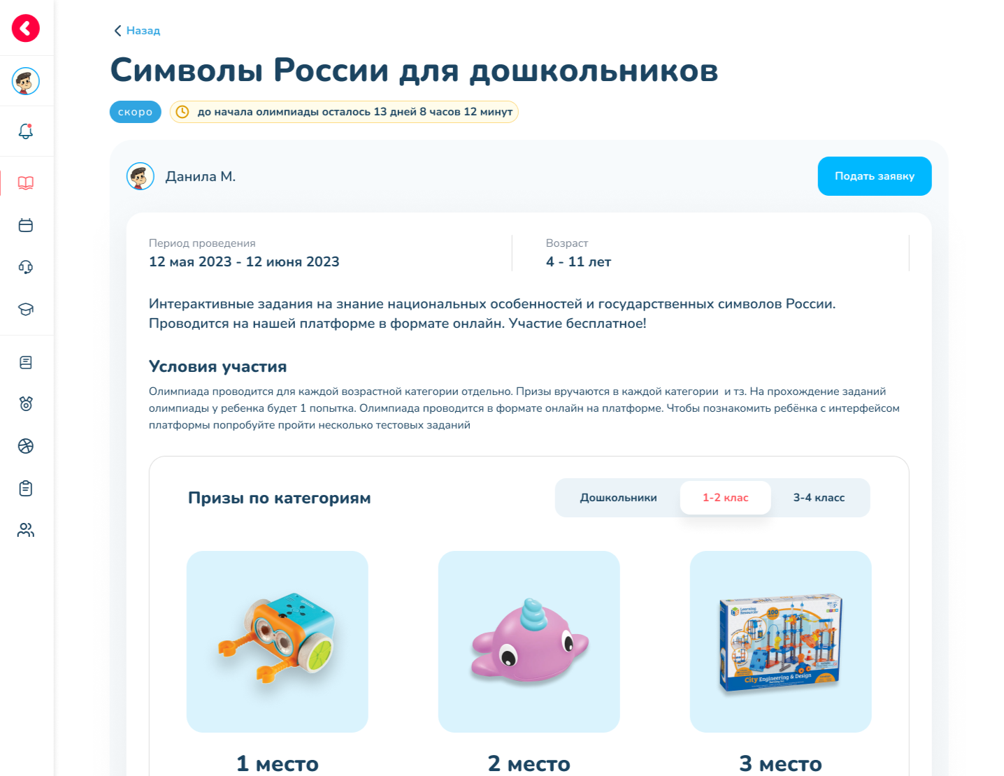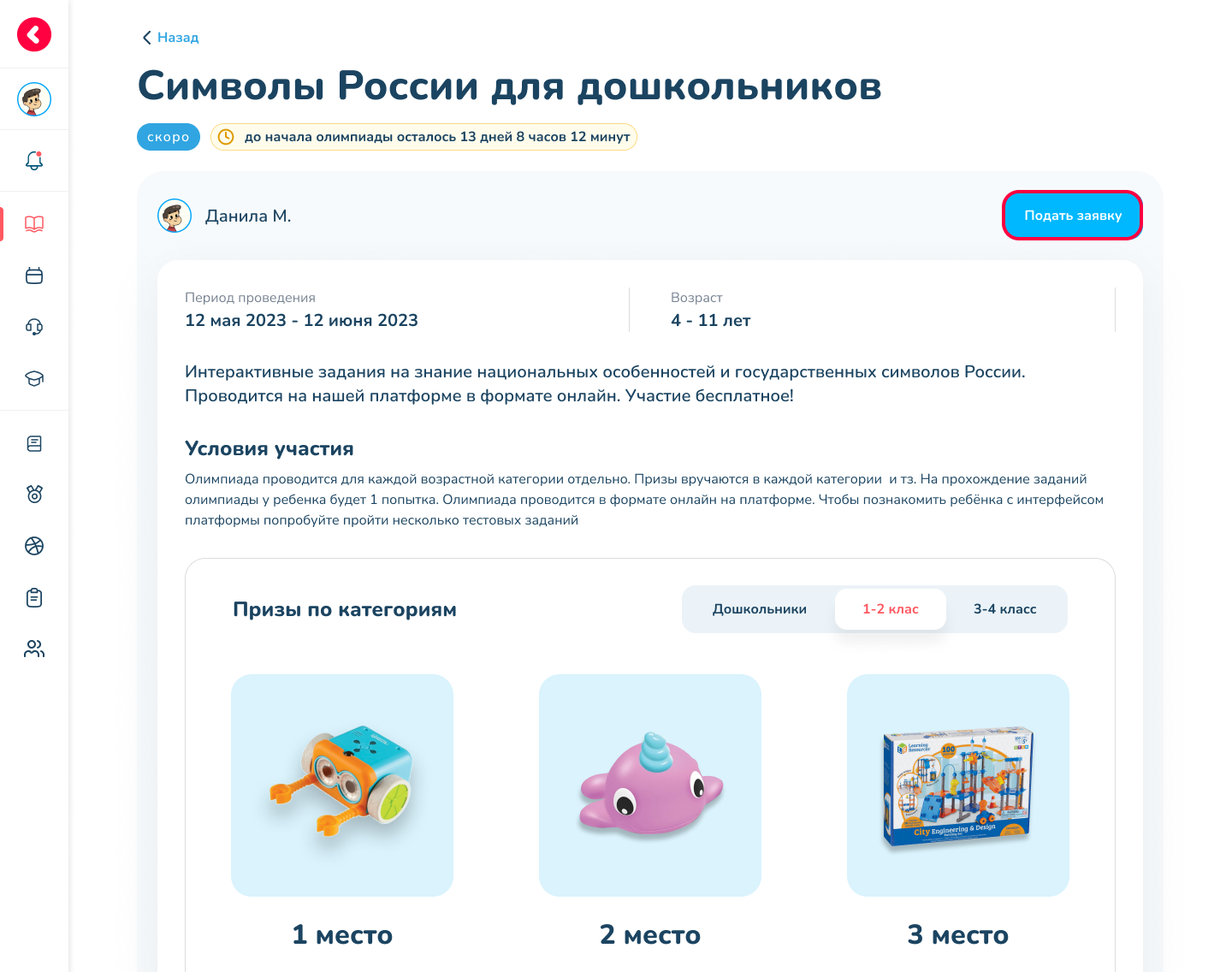 В раскрывшемся окне появятся подробности об олимпиаде, описание и опция «Подать заявку». Нажмите на кнопку.