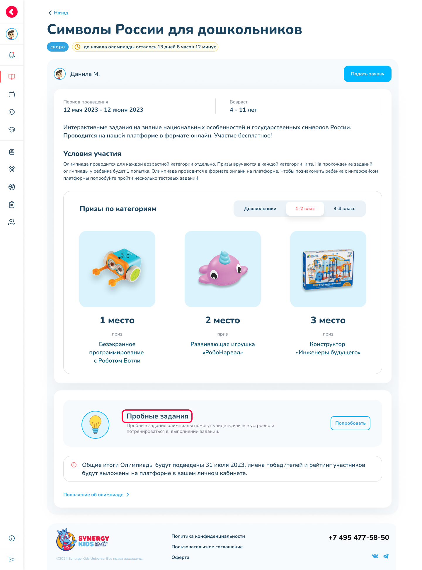 Состоит из интерактивных заданий. Время на прохождение ограничено. После выполнения заданий олимпиады ребёнок сразу видит свой результат: затраченное время и количество правильных ответов.